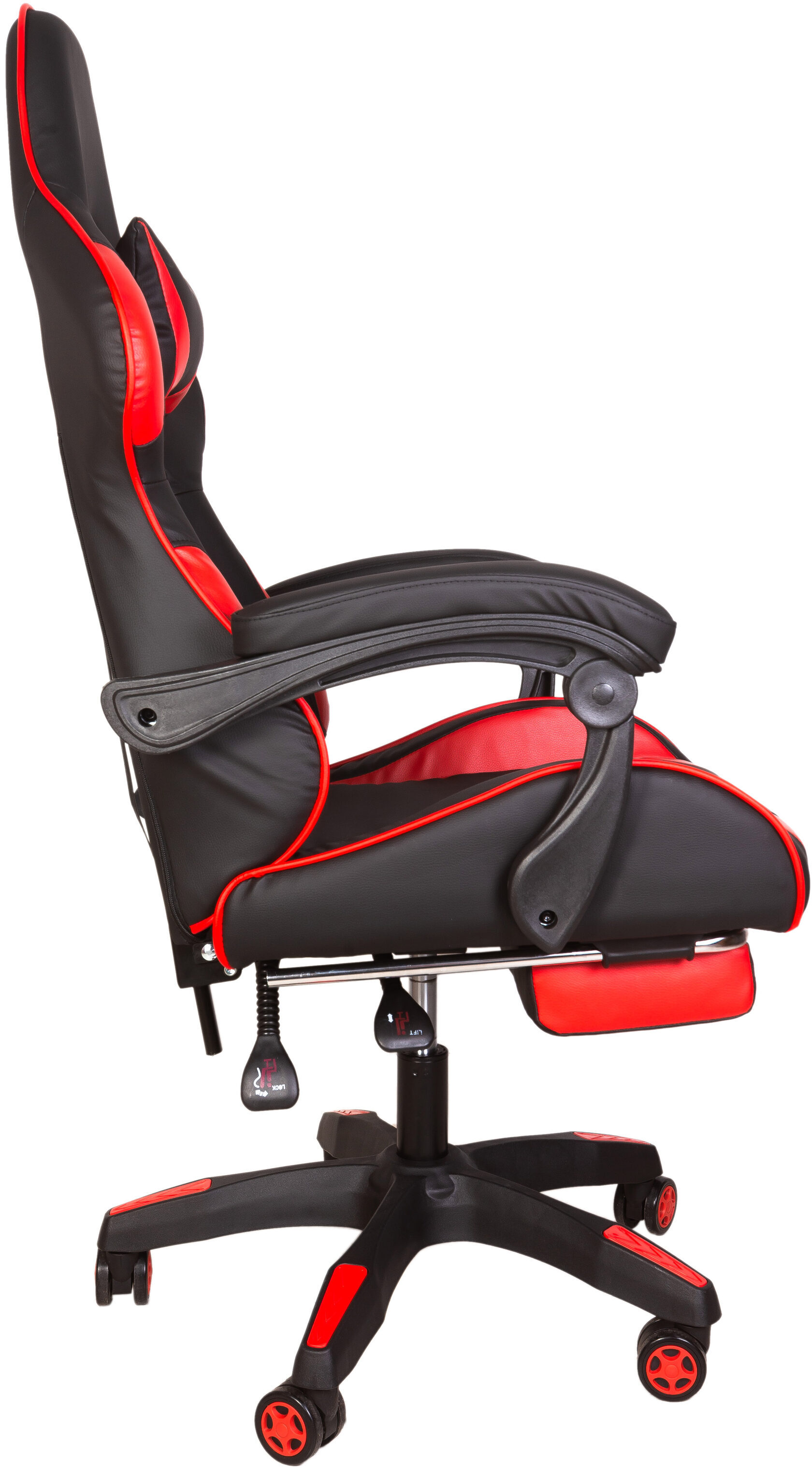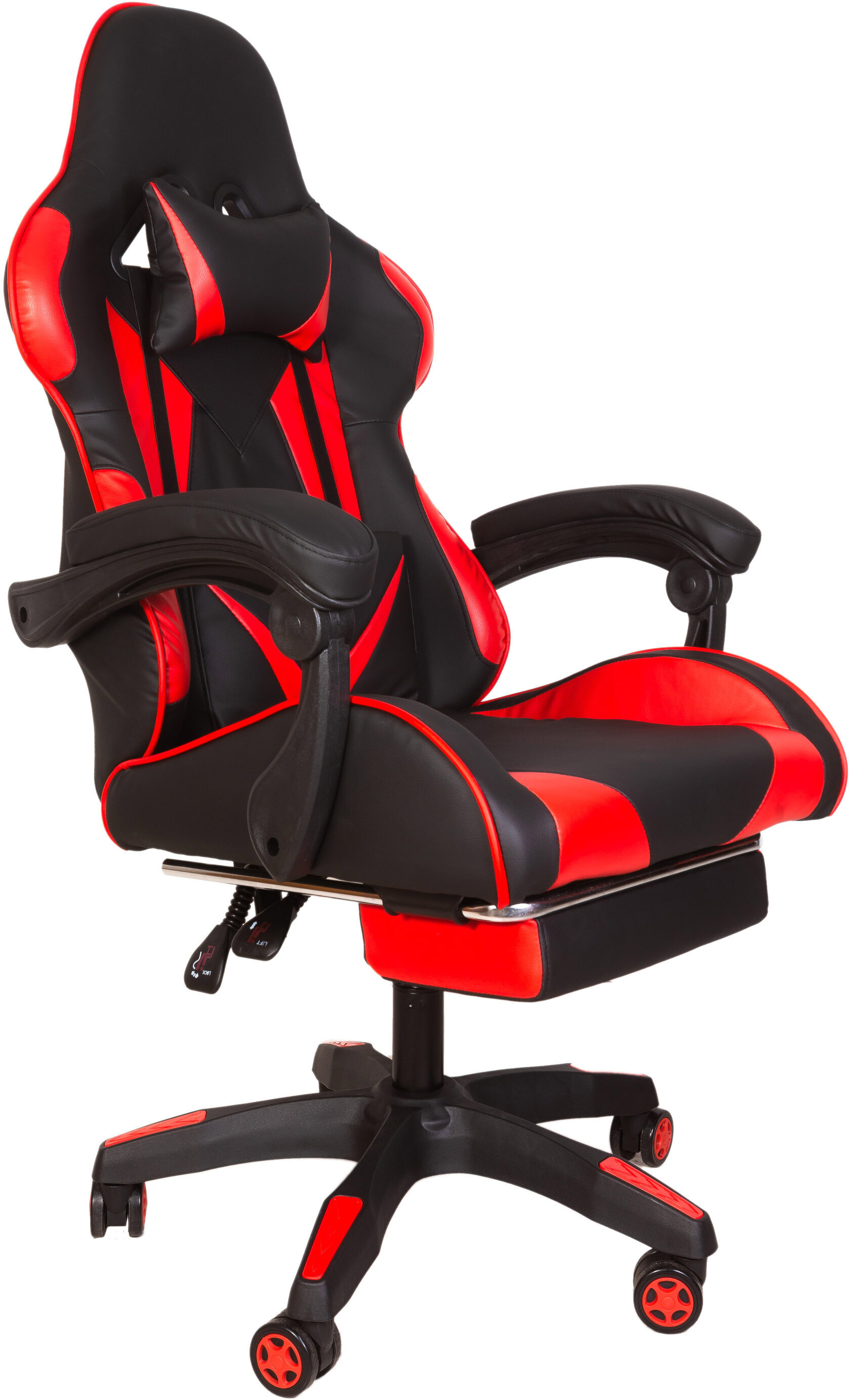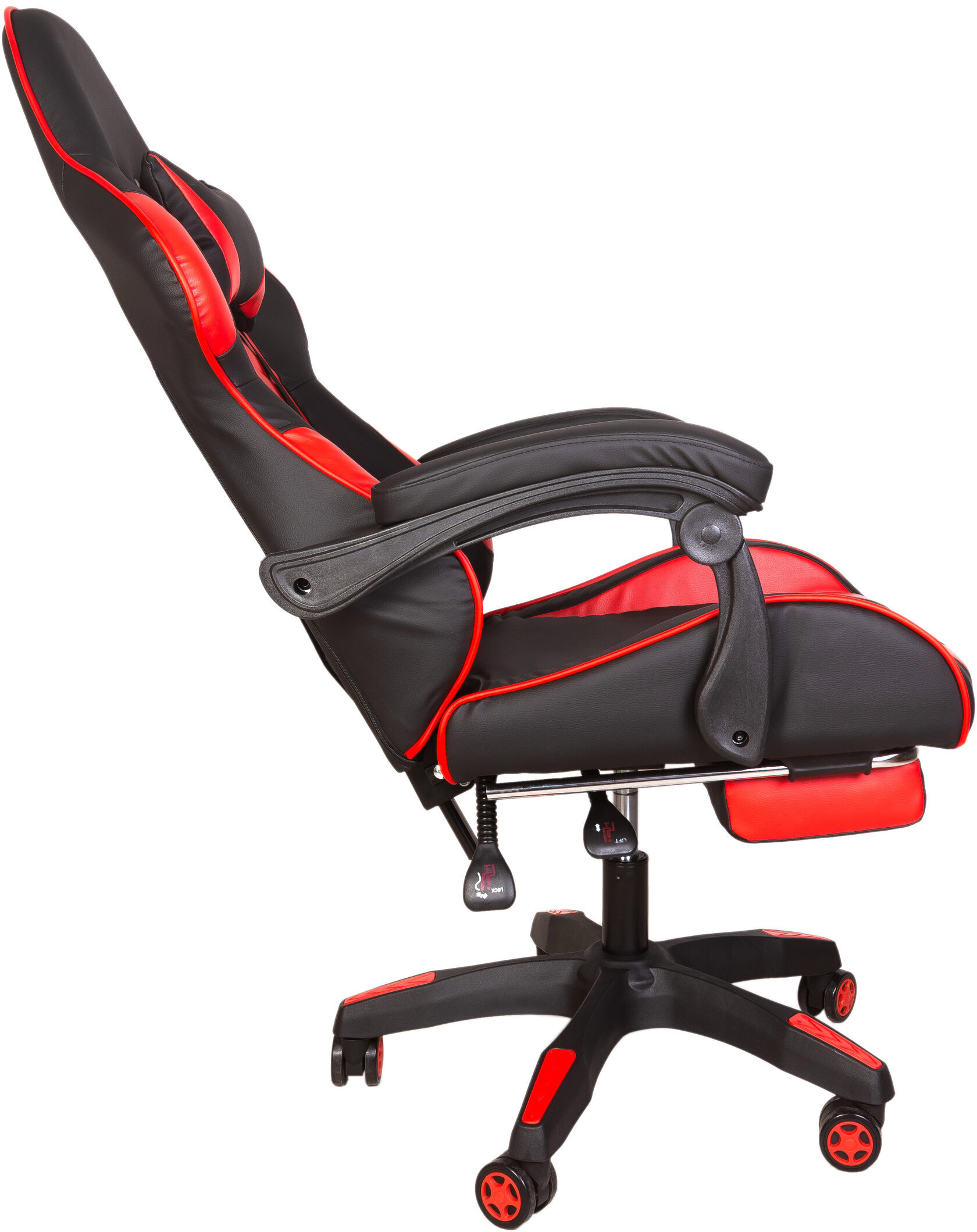 Кресло чёрно-красного цвета. Яркое смелое решение для тех, кто любит яркие цвета и насыщенные краски. Насыщенный красный цвет придаёт эксклюзивность данному товару. Подставка под ноги, которая в комплекте, делает отдых от работы или игры очень комфортным для владельца.