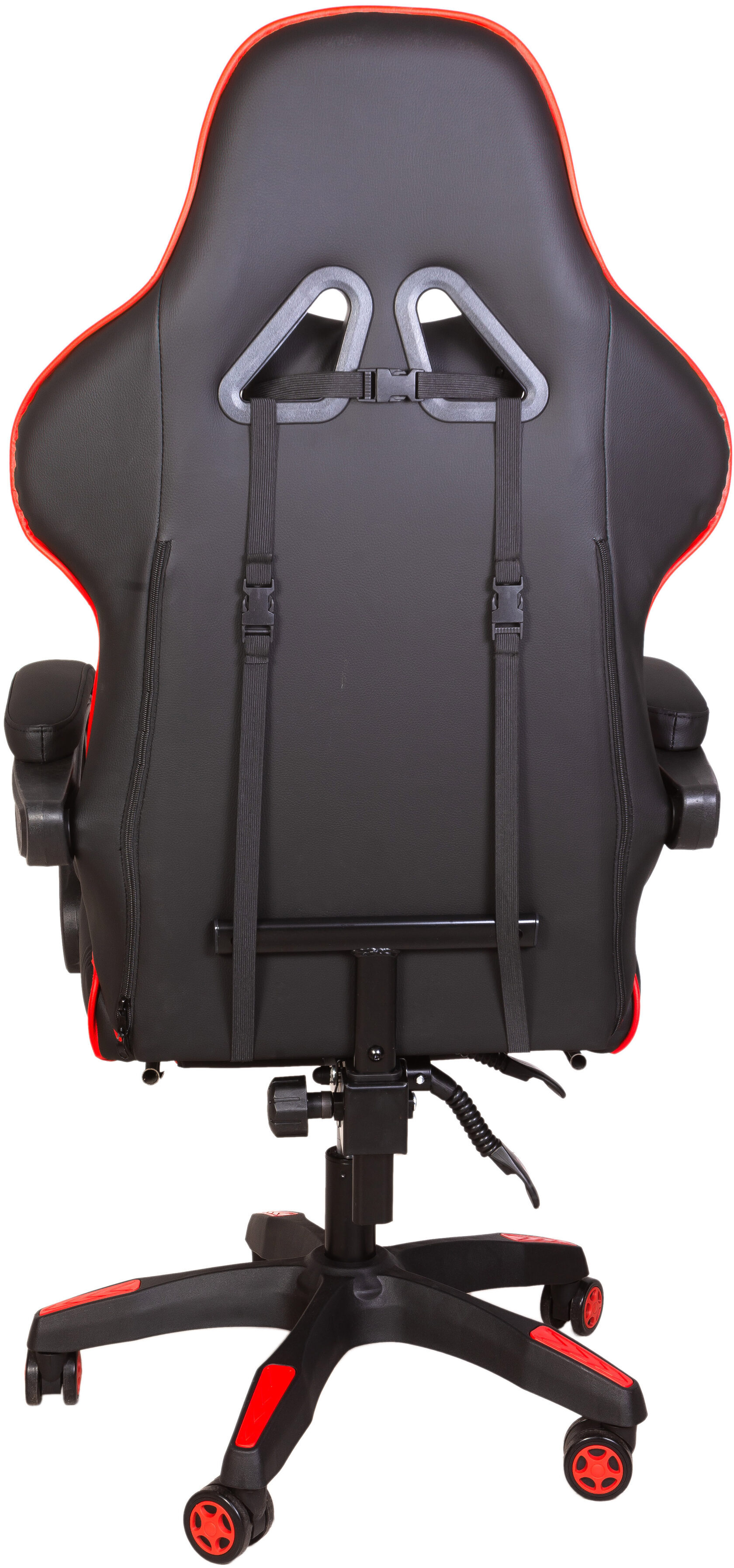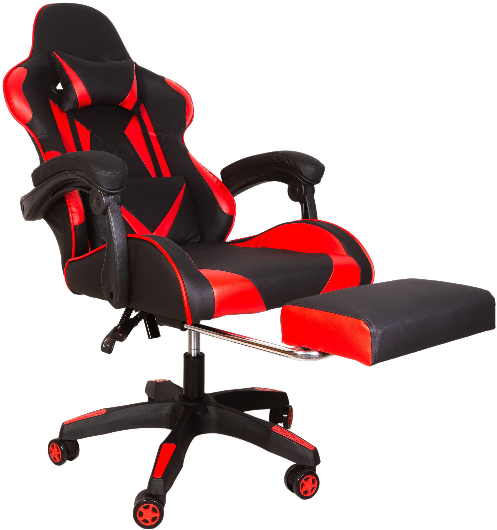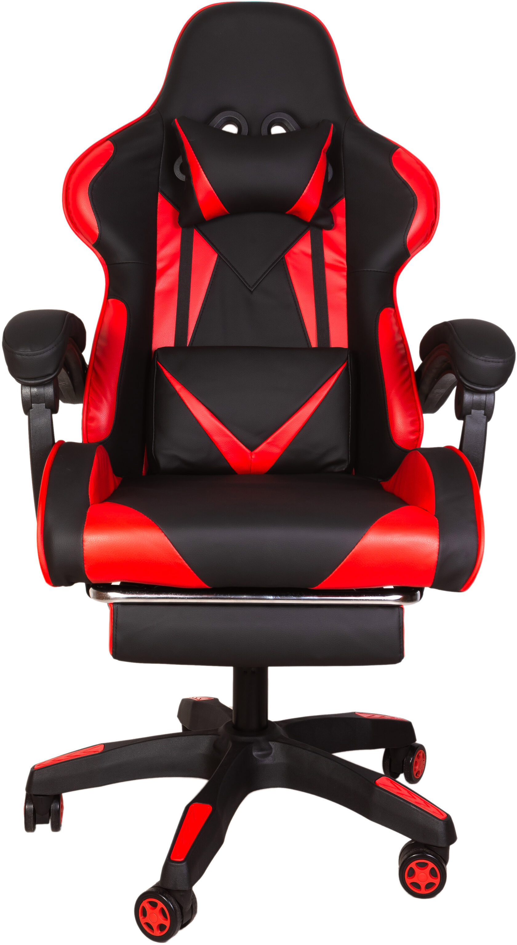 Кресло чёрно-красного цвета. Яркое смелое решение для тех, кто любит яркие цвета и насыщенные краски. Насыщенный красный цвет придаёт эксклюзивность данному товару. Подставка под ноги, которая в комплекте, делает отдых от работы или игры очень комфортным для владельца.