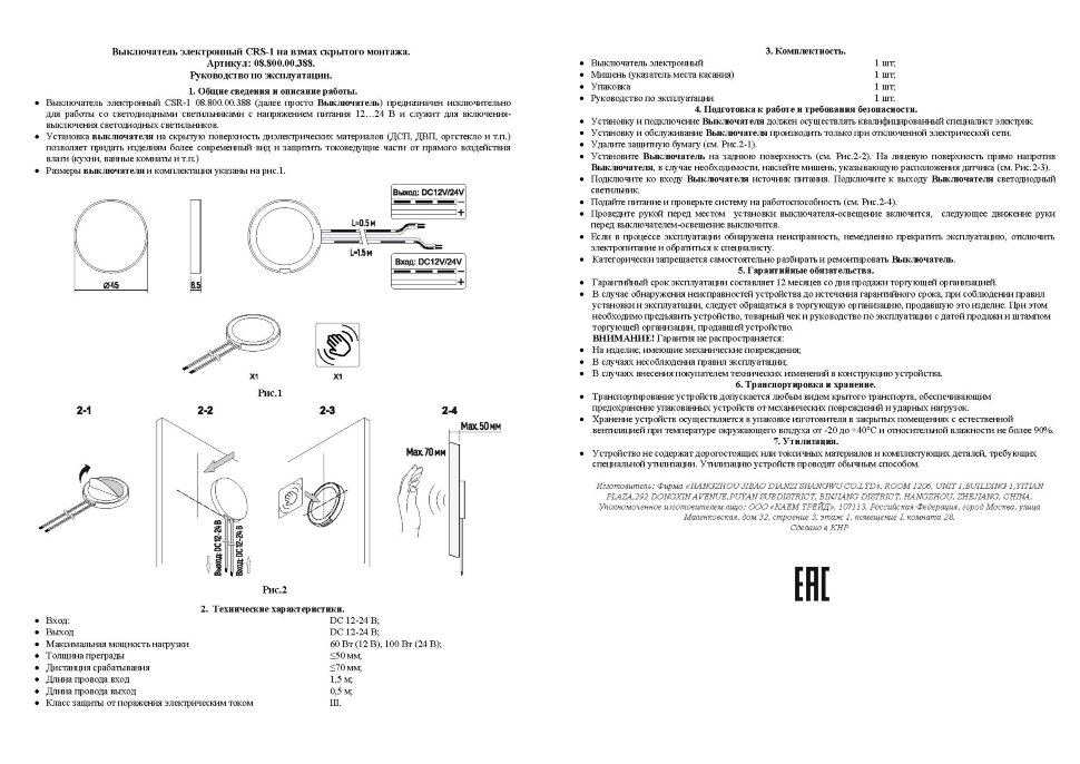 Выключатель CRS-1 на взмах черный, скрытого монтажа, 12/24В