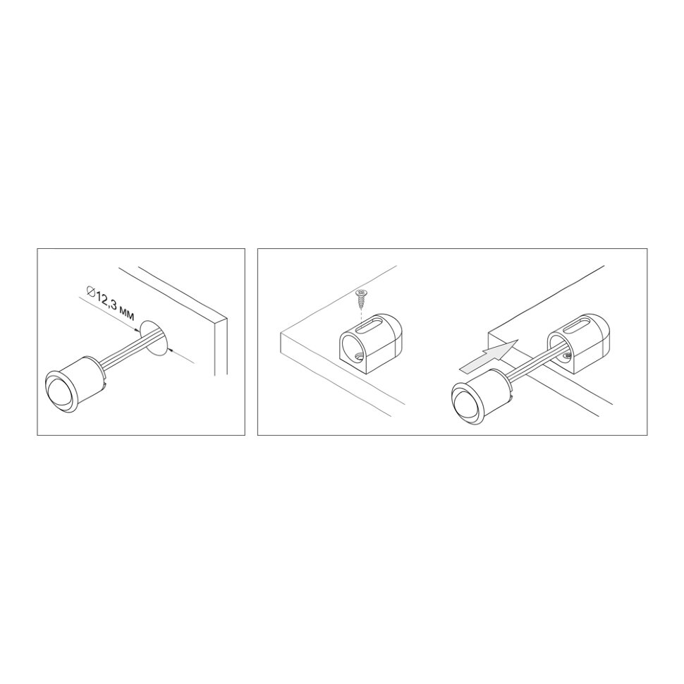 1-й способ : PIR сенсор устанавливается в монтажное отверстие D=12,3 мм, что позволяет устанавливать его в т.ч. в торец 16мм ДСП. Кабель прокладывается в монтажное отверстие.